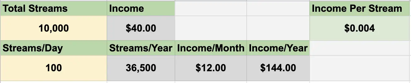 Then, in the second row, you can input your streams per day, and immediately see how many streams you can expect to get per year, as well as your income per month, and your income per year.